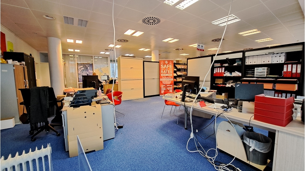 The ground floor includes a very large office space (currently divided into semi-separate offices by placing filing cabinets), a separate office (office manager), a technical room (e.g. copier, office printer/scanner).
