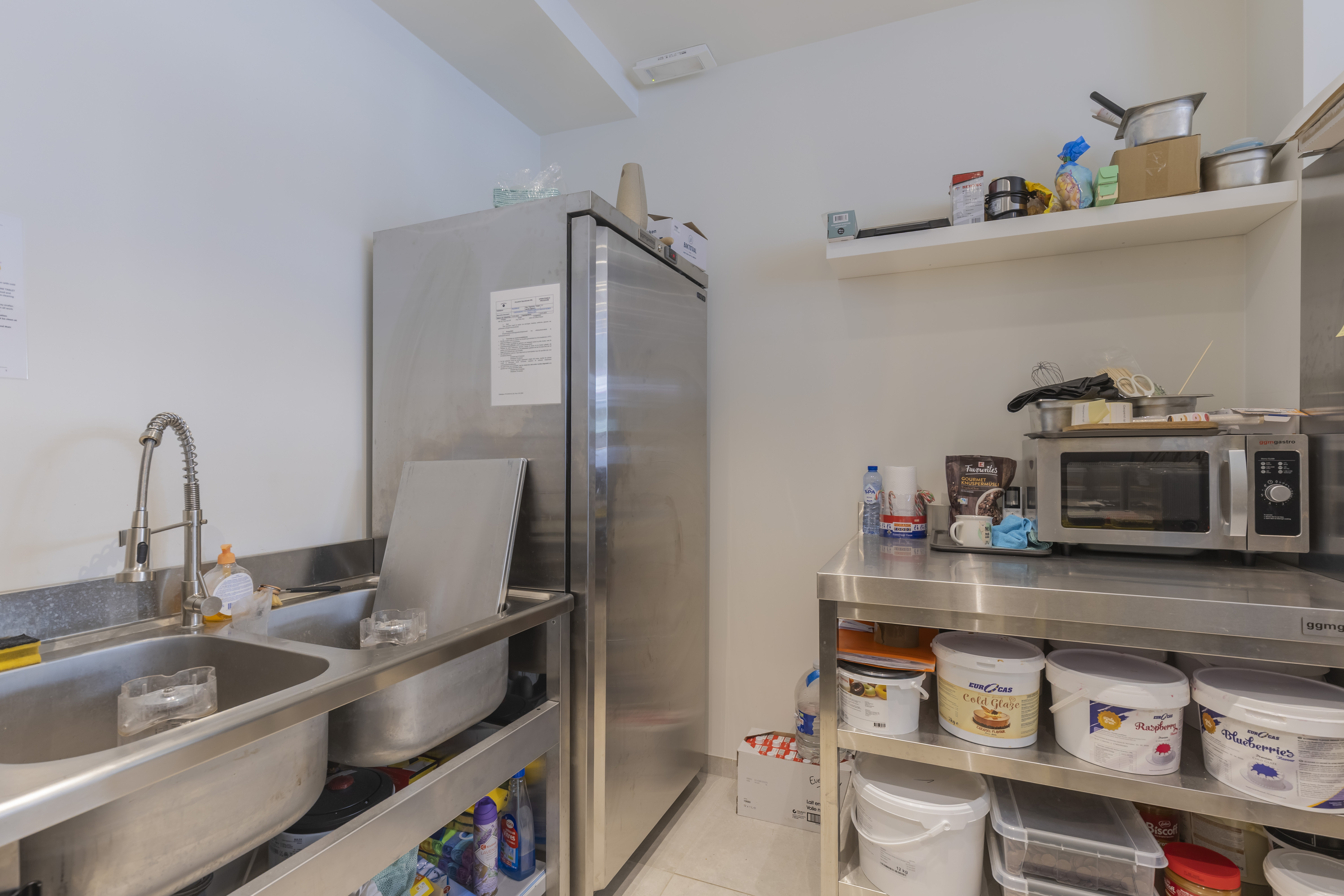 Cuisine entièrement équipée avec machines, comptoir réfrigéré, machine à café, congélateur, bain-marie.