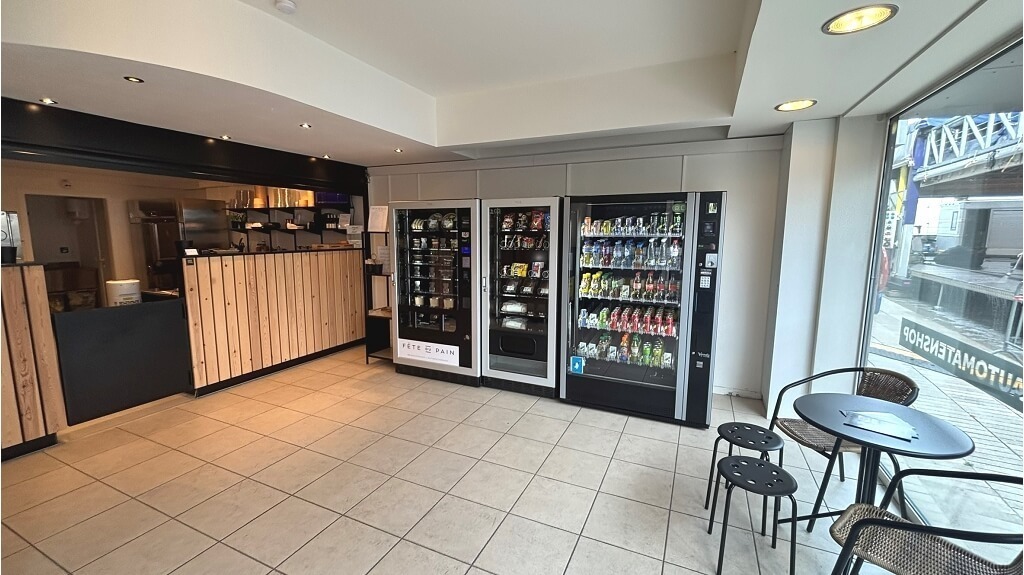 Comprend un espace commercial d'environ 50 m² avec comptoir et 3 distributeurs automatiques, ainsi qu'une cuisine entièrement équipée. 3 distributeurs automatiques (1x Vendo 2x FAS), dont 1 avec des boissons et 2 avec de la nourriture (notamment des spaghettis, des lasagnes, des desserts, des bonbons, etc.).