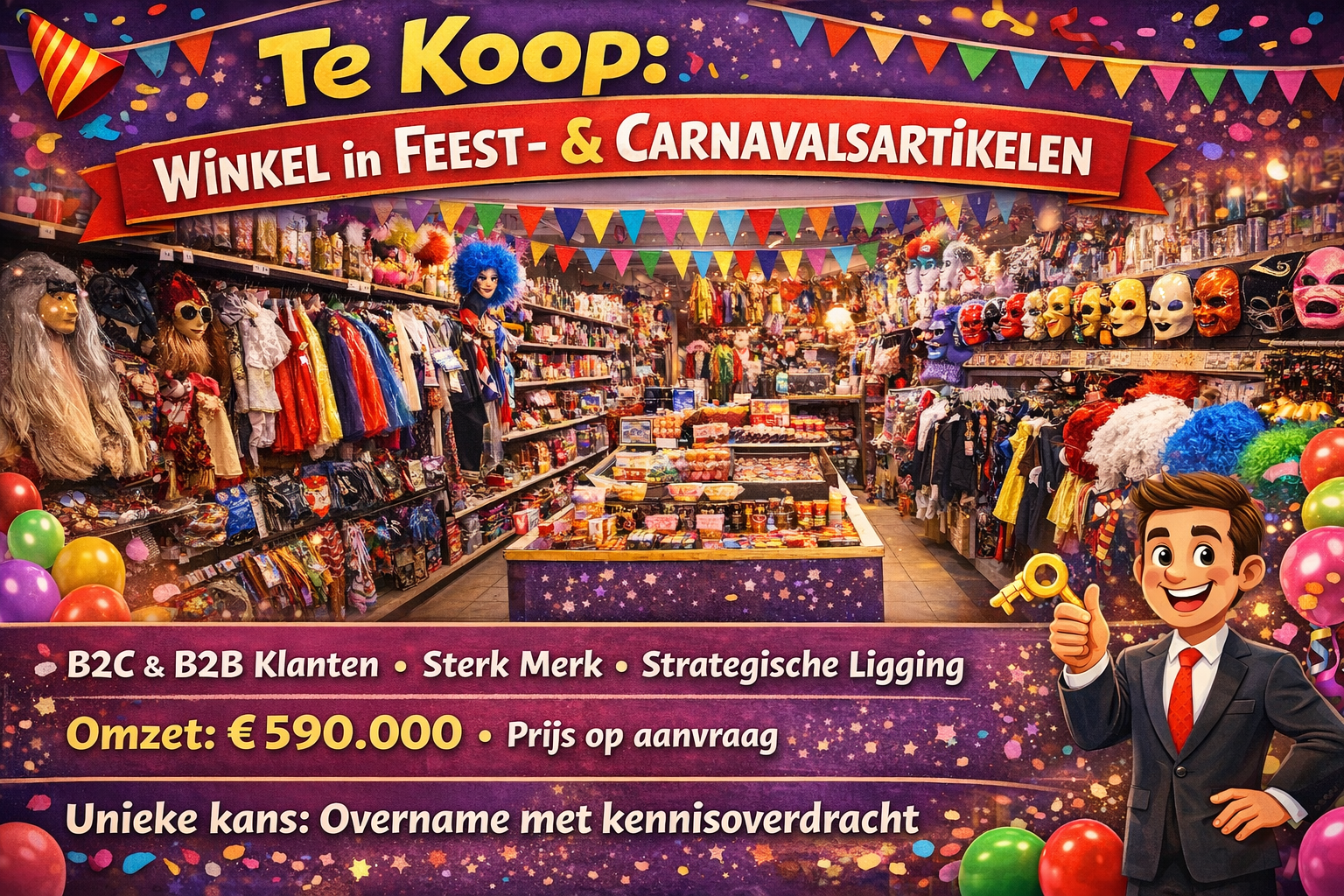 Opportunité unique de reprendre une entreprise bien établie dans le domaine des articles et vêtements de fête. L'entreprise dessert à la fois des clients B2C et B2B et est fortement implantée en Belgique et aux Pays-Bas. Grâce à un large assortiment et à une marque forte, elle est pertinente tout au long de l'année, avec des pics pendant le carnaval, la fête du Roi, Halloween et d'autres événements.