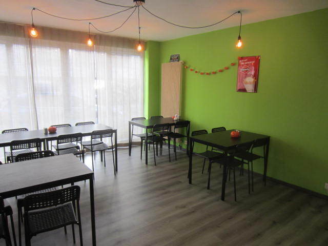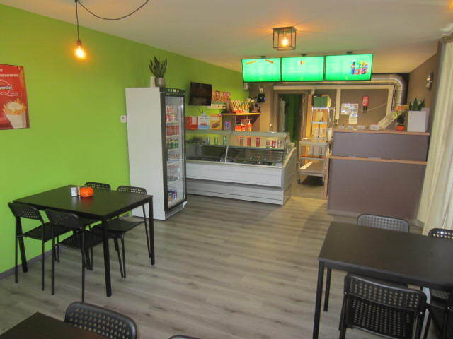 Deze zaak beschikt over een verbruikzaal van ongeveer 55 m2 met een bedieningskoeltoog en een 20 tal zitplaatsen en 4 tv schermen .