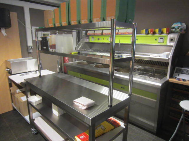Een geinstalleerde keuken met al het nodige materiaal waaronder drie diepvriezers waarvan één nieuwe , nieuwe inox tafels , nieuwe bain - marie nieuwe afwasmachine .