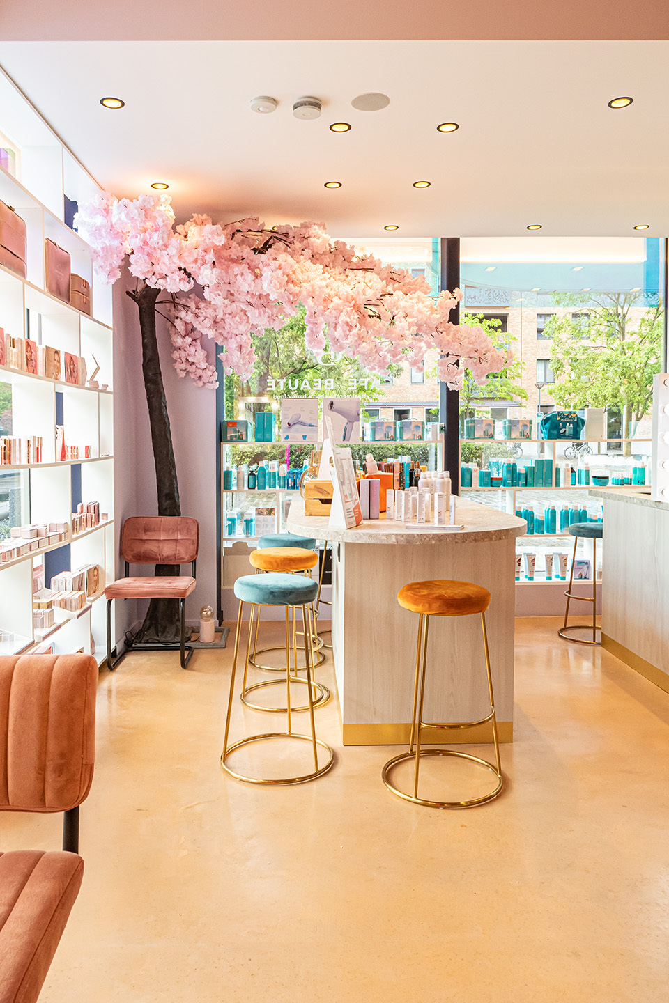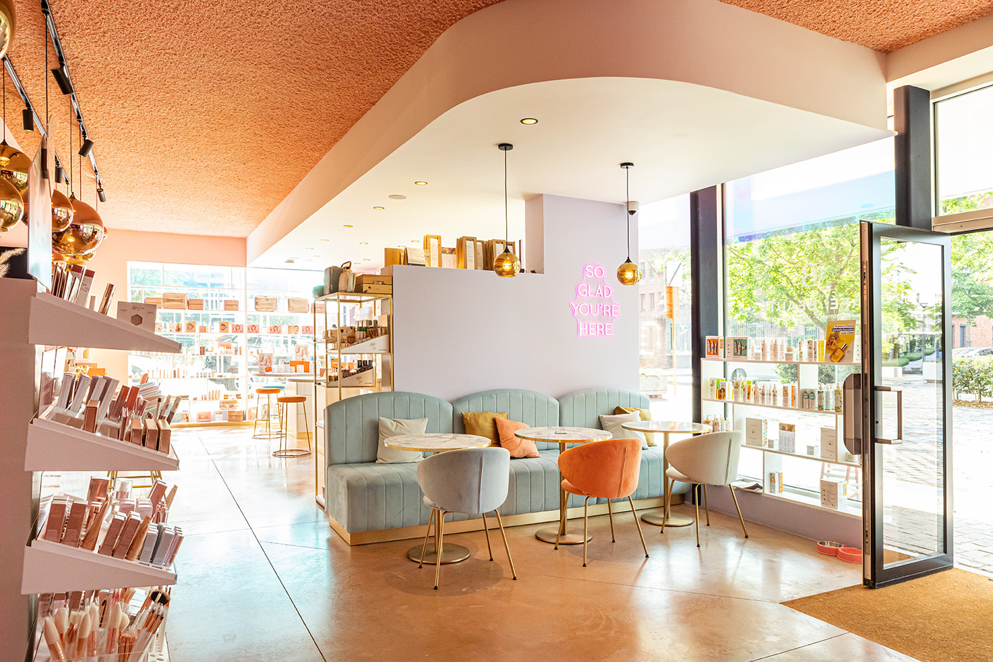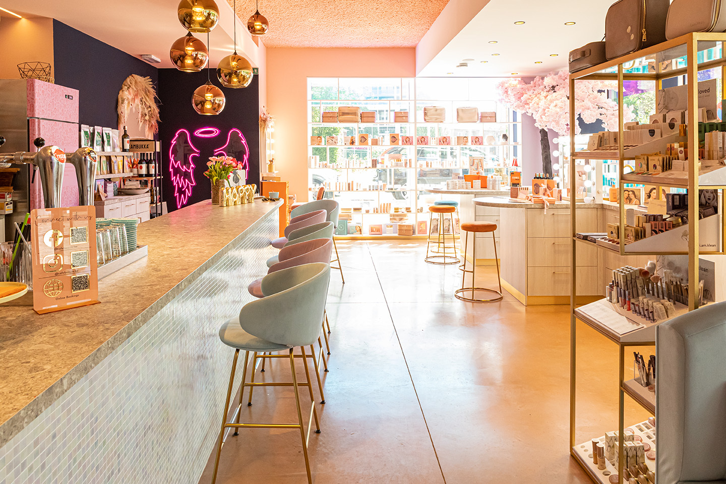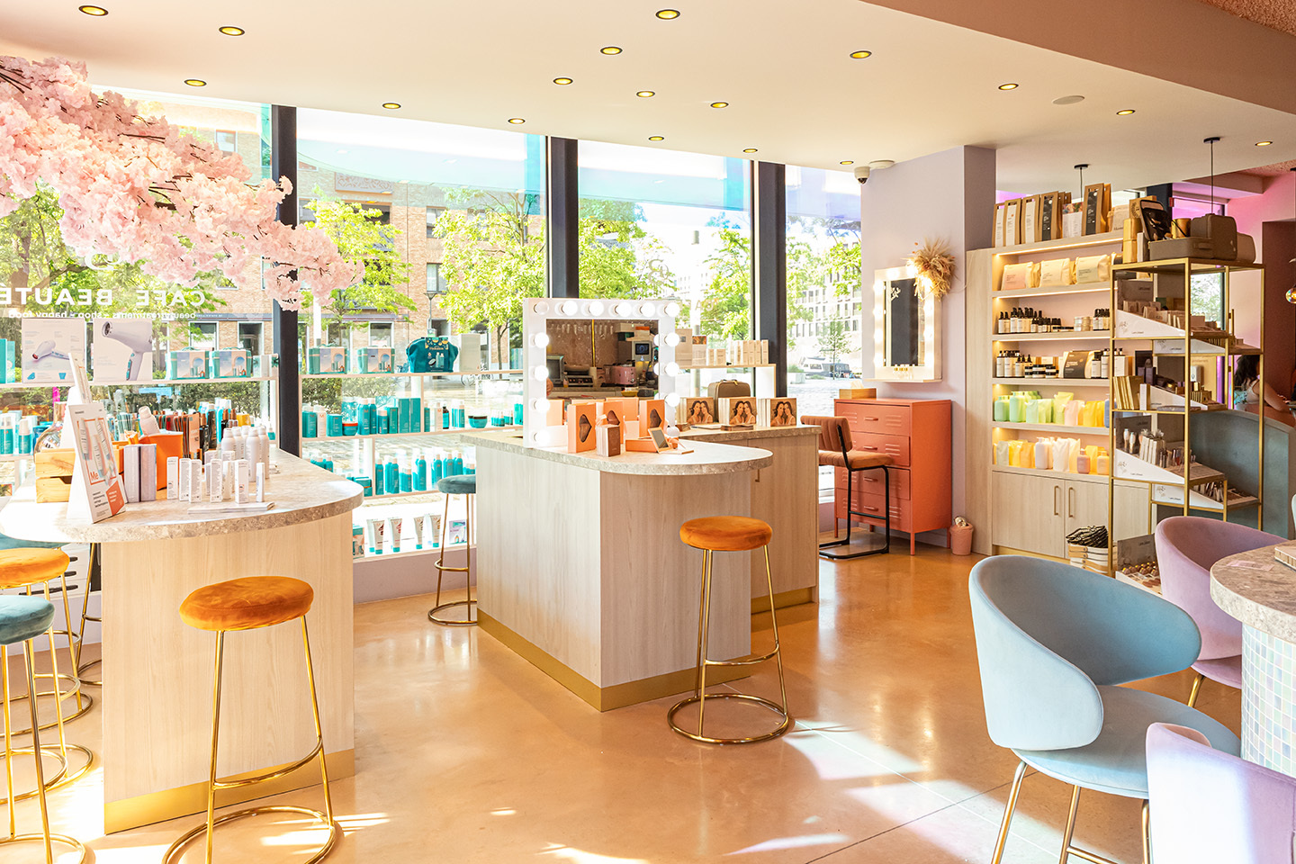 Bij Café Beauté kon je zo even binnenlopen om verzorgings- of cosmeticaproducten te kopen, gewoon iets te komen drinken of eten, of één van de vele beautybehandelingen te laten doen.