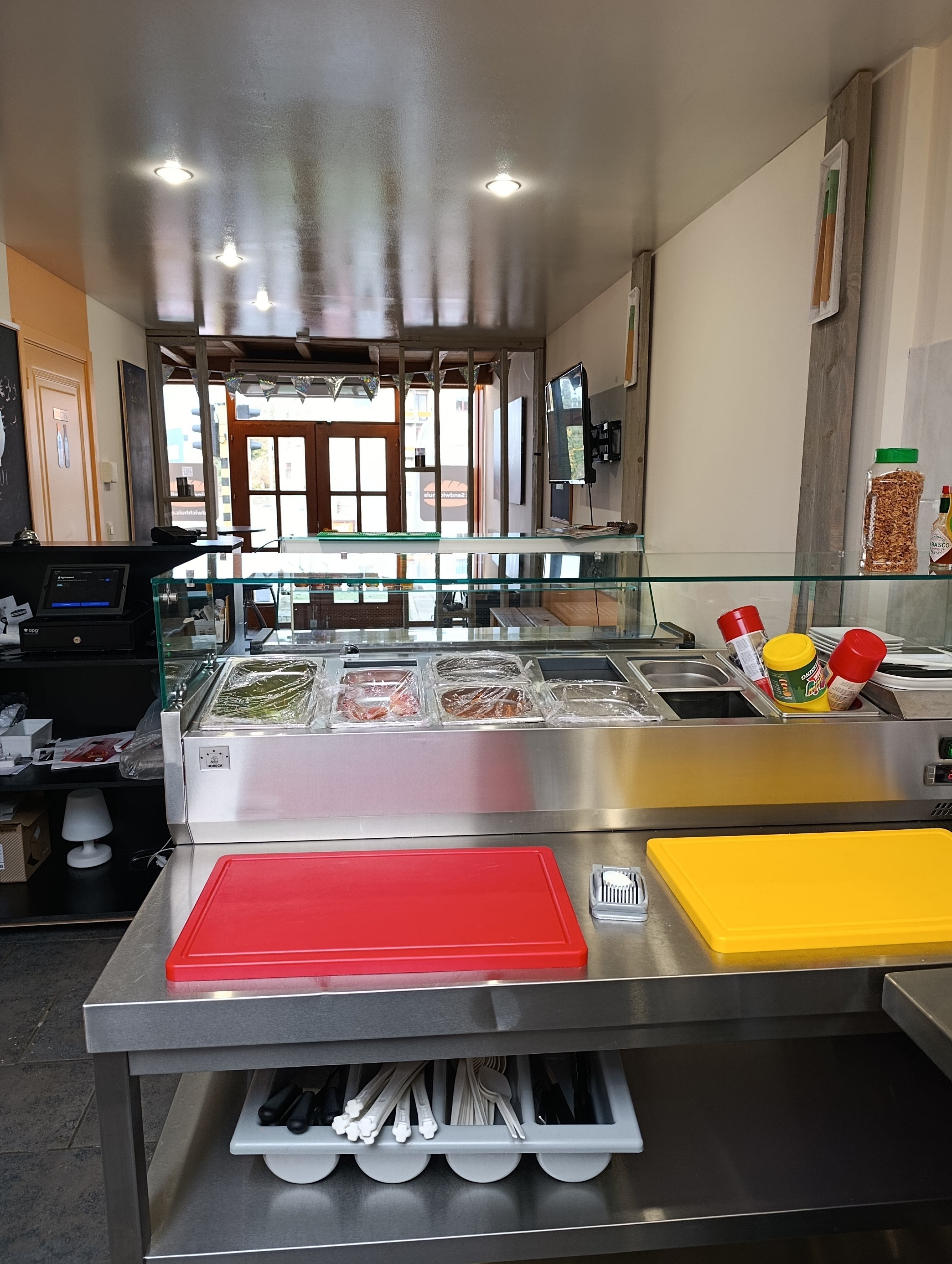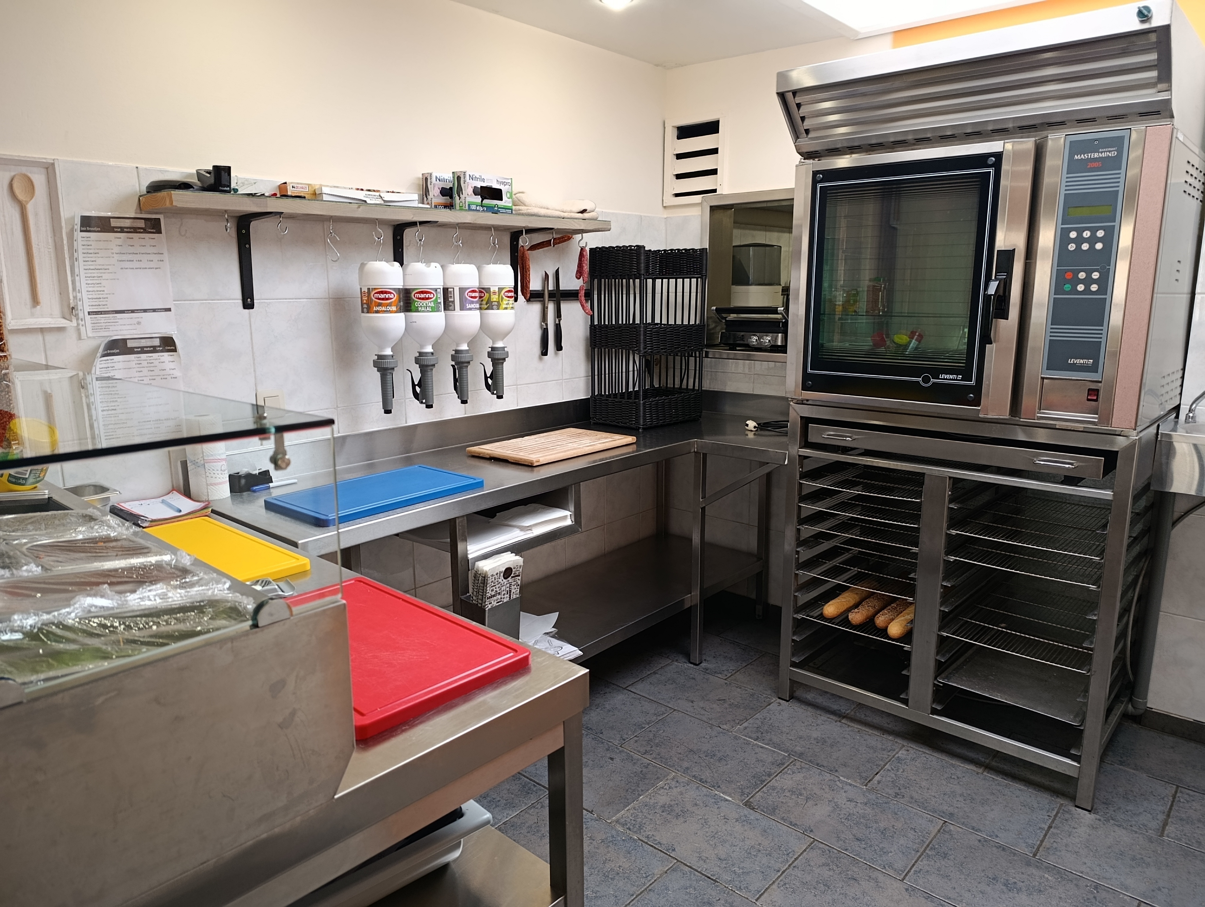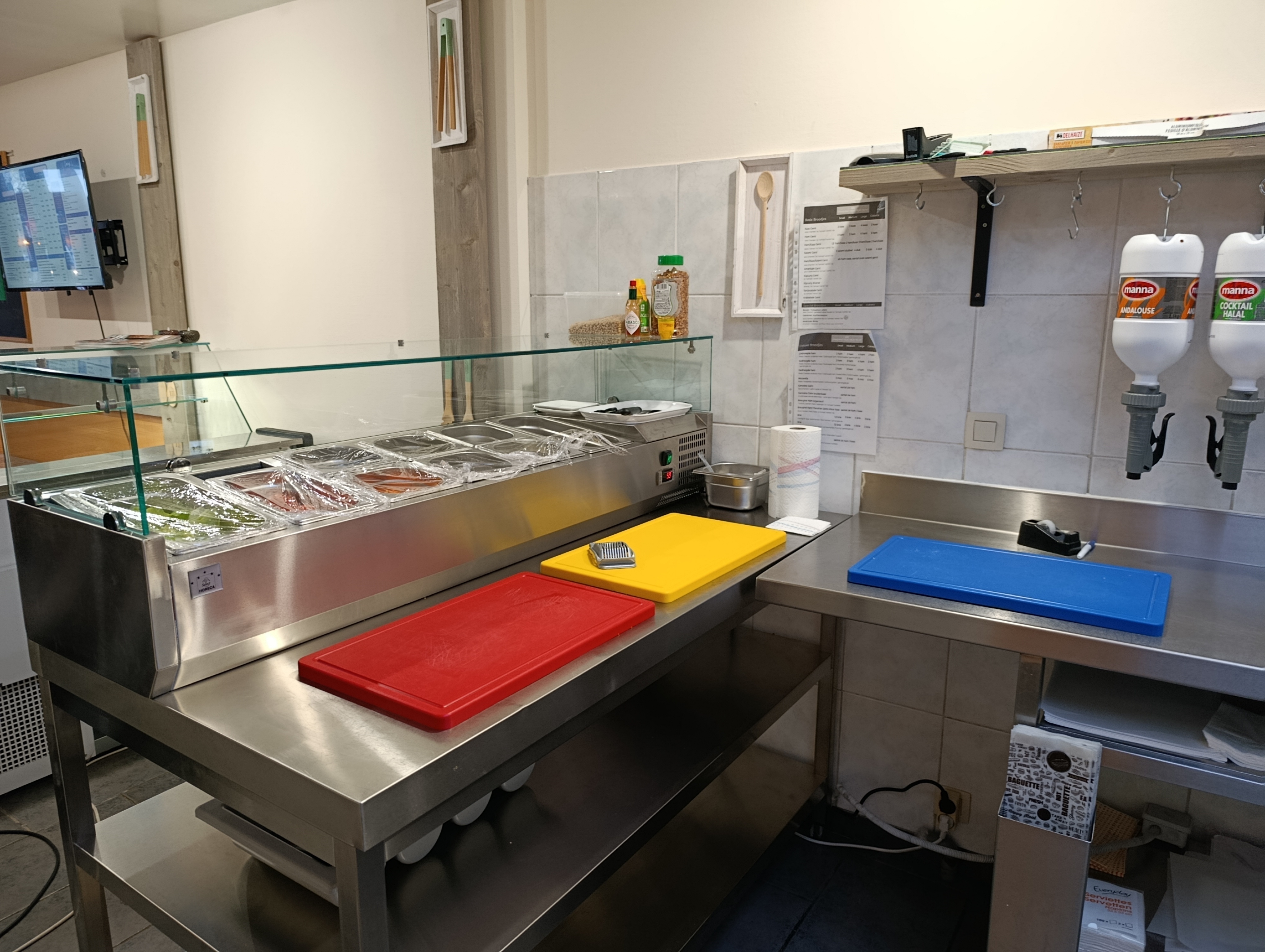 - Handwasbakje bij werktafels voor het bereiden van de broodjes