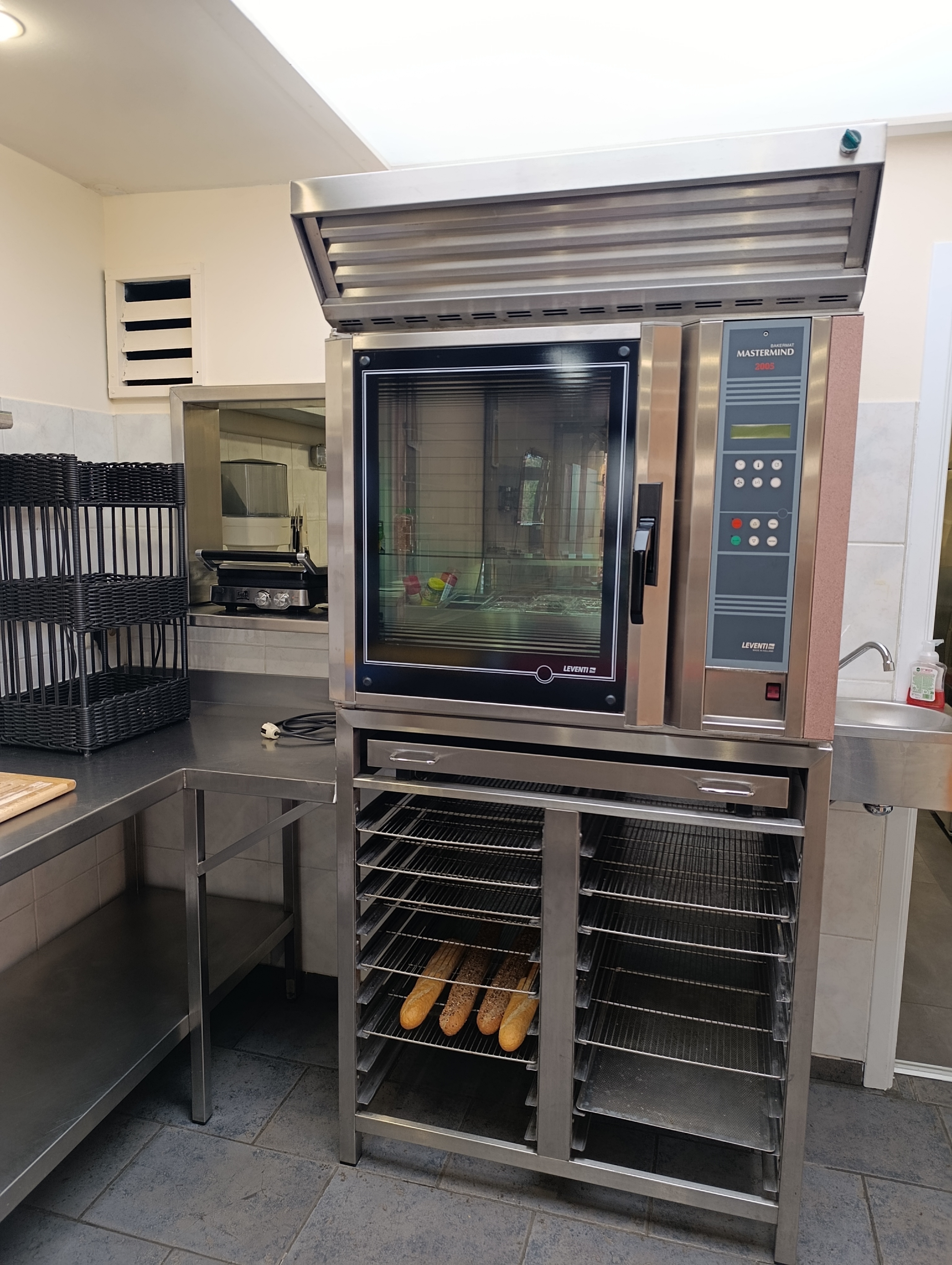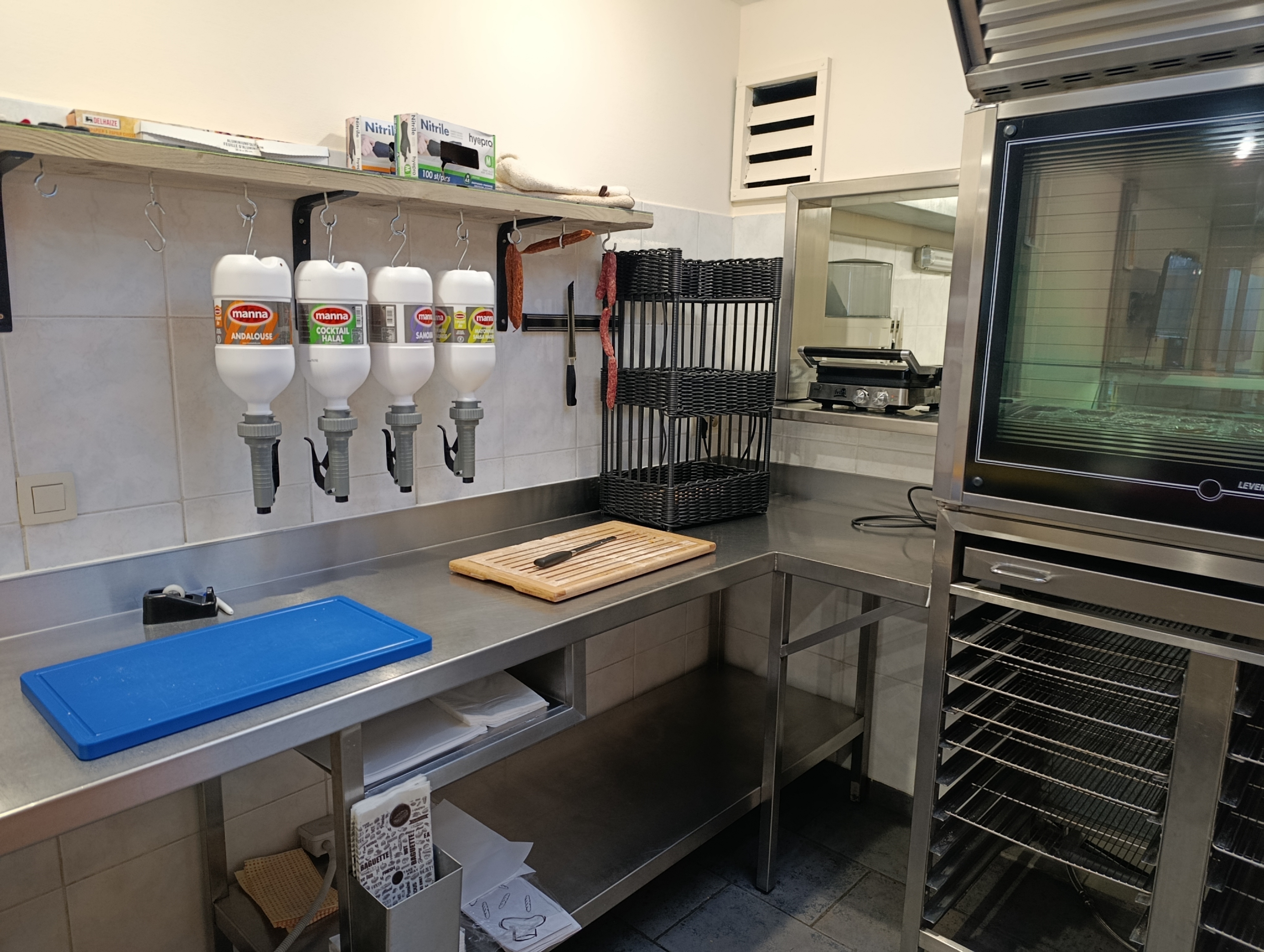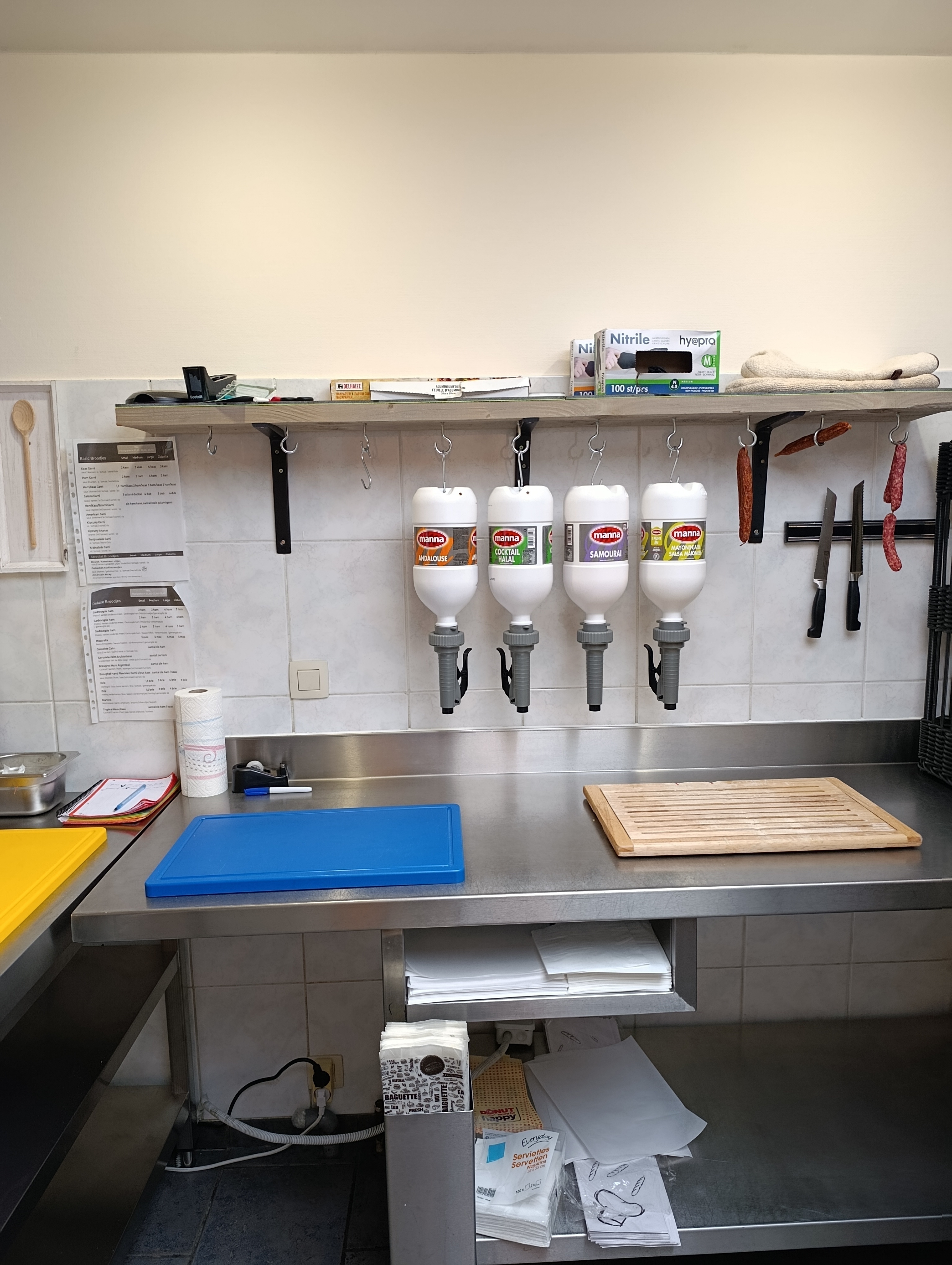 - Handwasbakje bij werktafels voor het bereiden van de broodjes