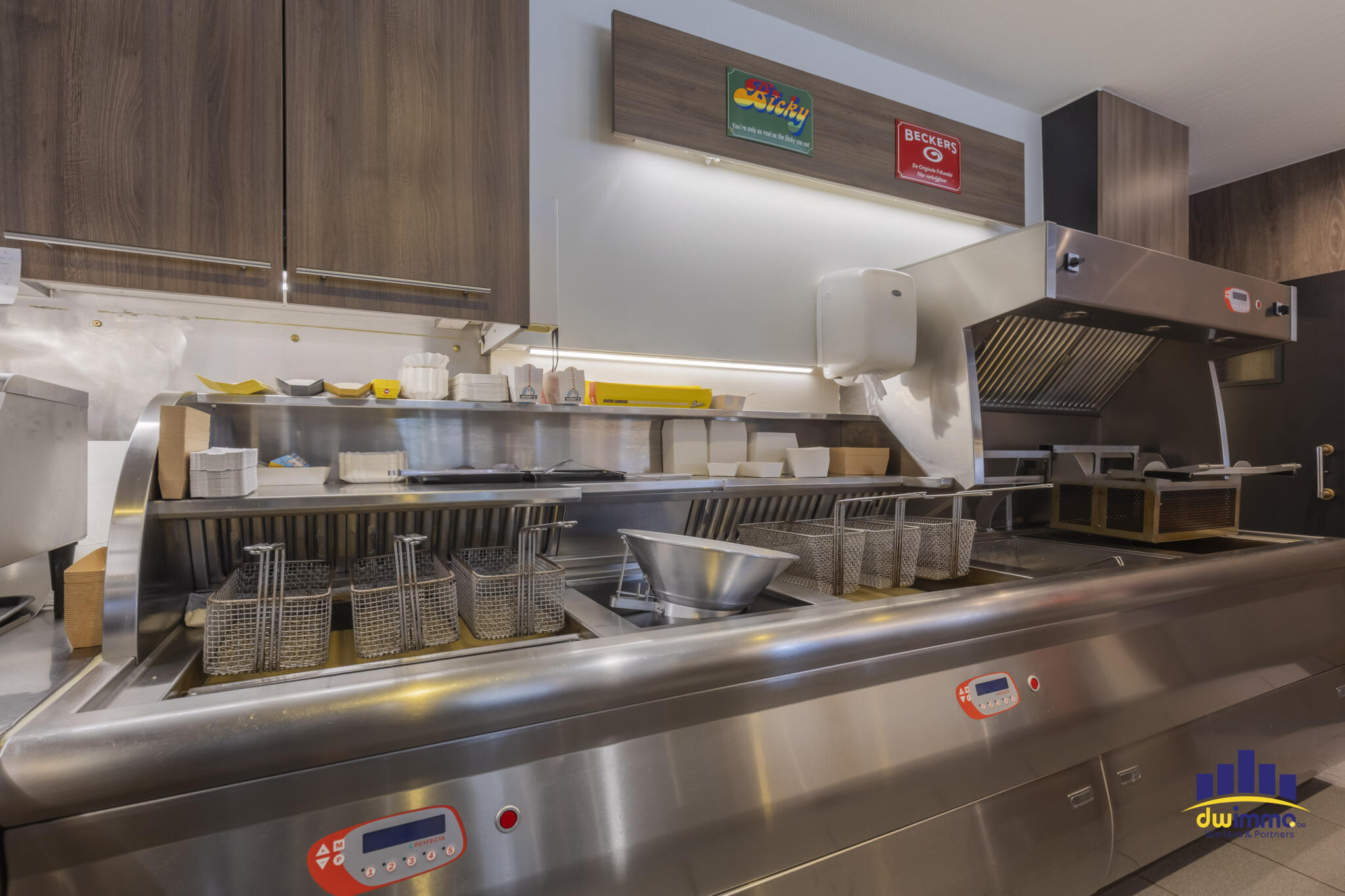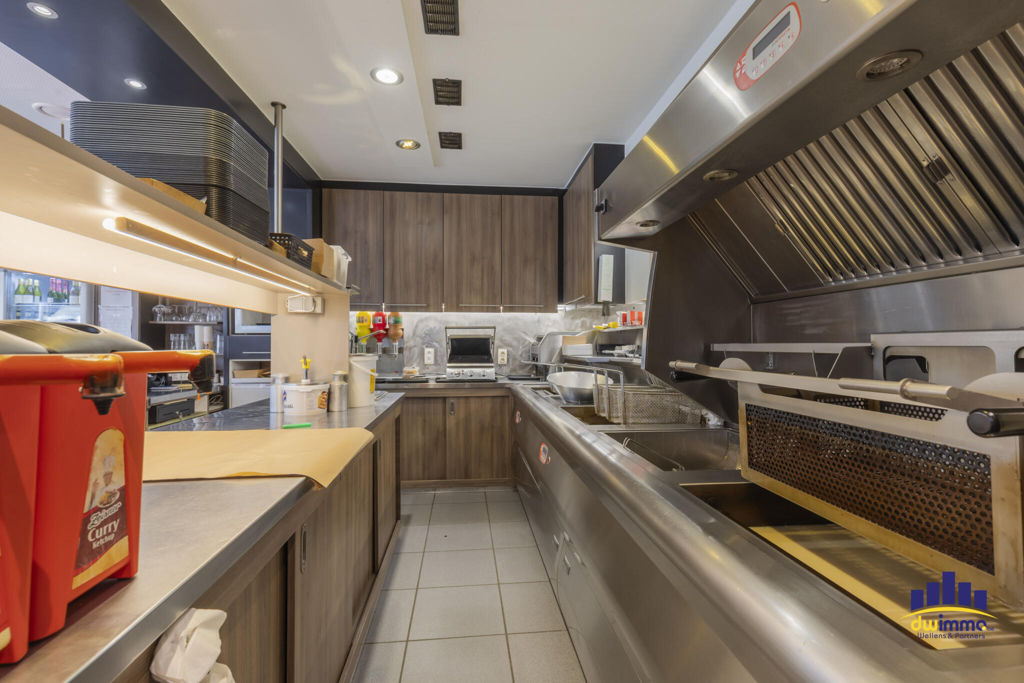 De frituur is volledig uitgerust met professioneel materiaal, waaronder een Perfecta friteuse met automatische voorbak en pompsysteem voor het vet, een Merrychef high-speed oven, een gasvuur met vier bekken, microgolfovens, een gekoelde toonbank, een frigocel en diepvriescel, verschillende drankenkoelingen en een industriële vaatwasmachine. Daarnaast zijn er vier tv-schermen aanwezig in de zaak camerabewaking & airco.