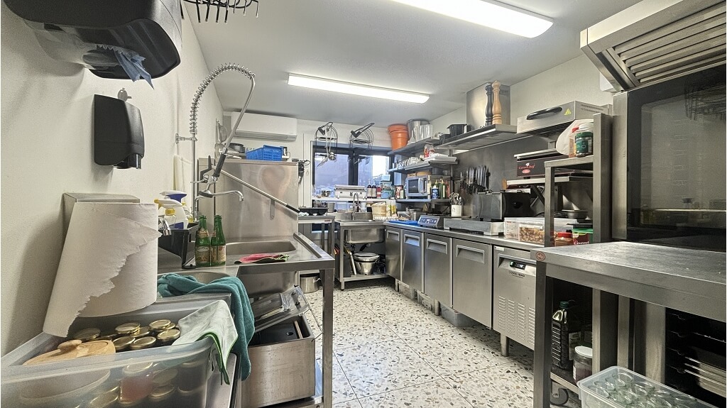 Omvat een gelagzaal met comptoir met een capaciteit van 28 personen, een ruim terras achteraan met een capaciteit van 45 personen, zeer ruime ingerichte keuken, stockageruimte en toiletten