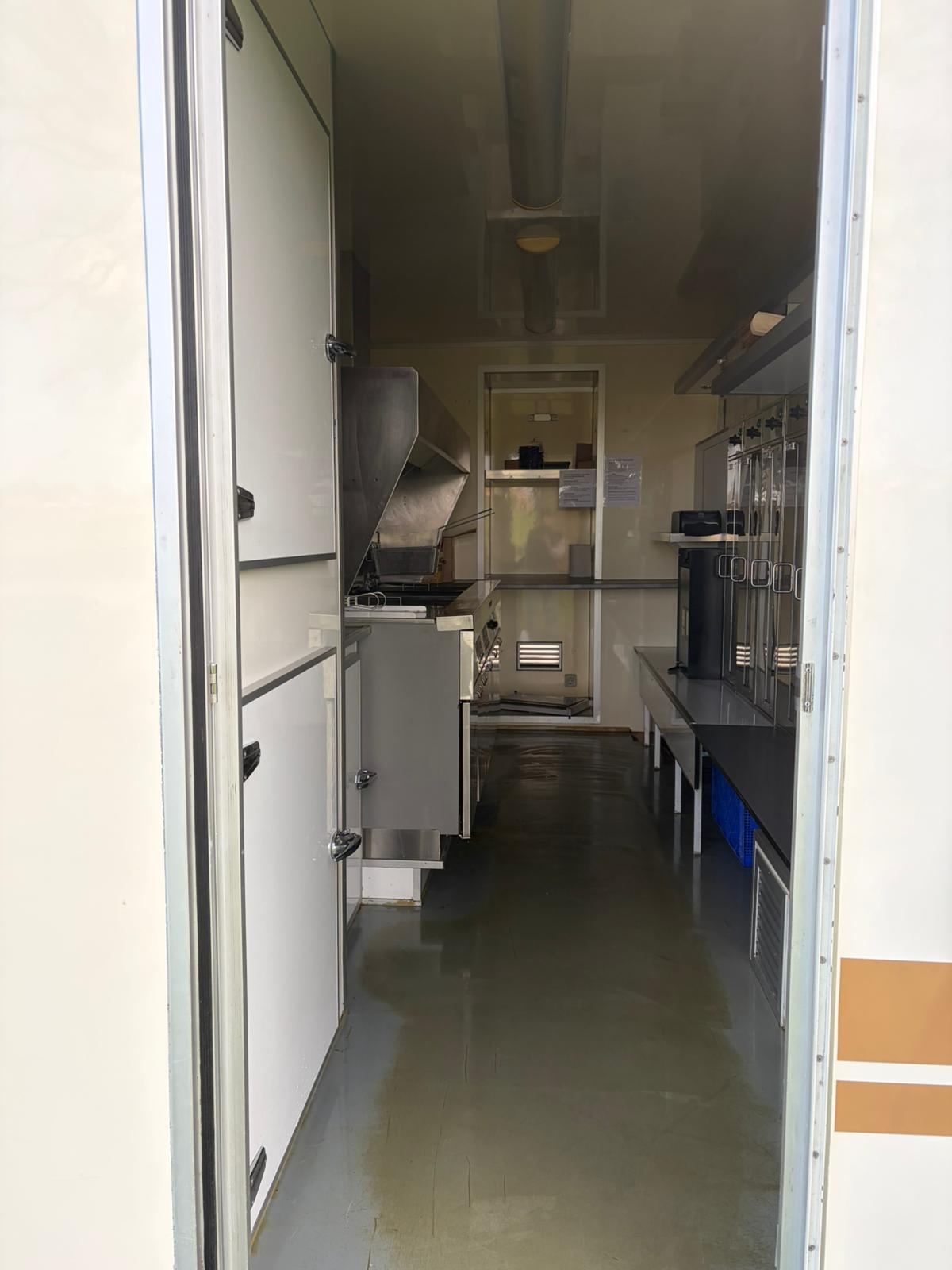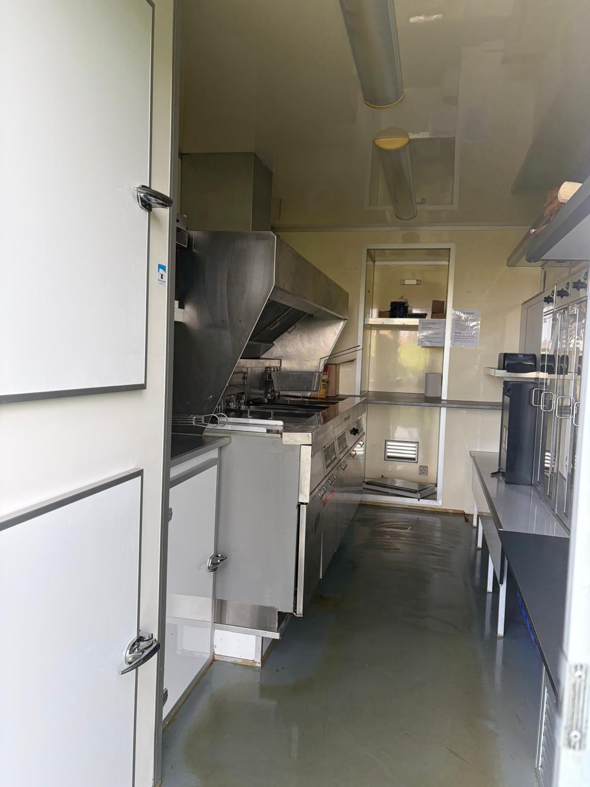 Mobiele snackmuur met loketjes, ingebouwde friteuses, dampkap, koeling.