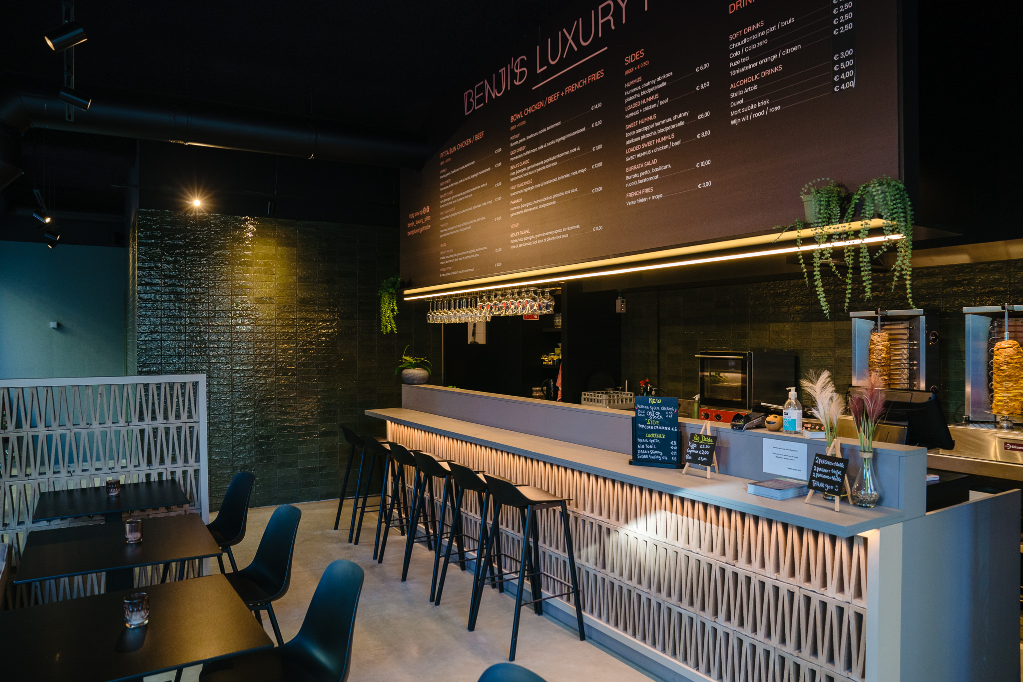 "Benji's Luxury Pitta", een trendy ingerichte handelszaak die zich leunt naar een "street food concept" - gelegen in een aantrekkelijke horeca-/wandelstraat te Oostende - gezellig hedendaags interieur ingericht door Luum (Vandecasteele), met oog voor detail.