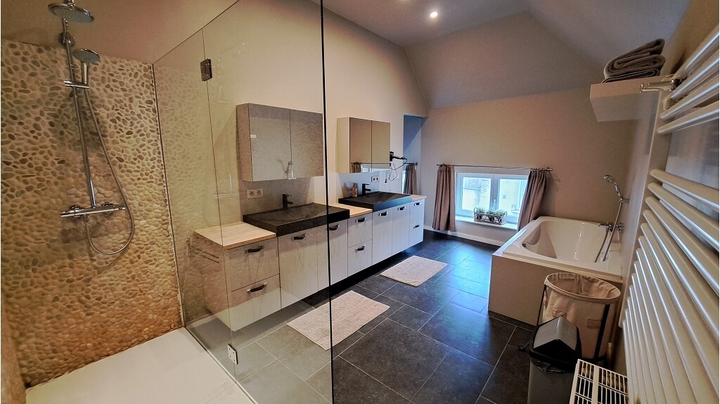 De tweede verdieping omvat een grote slaapkamer, berging en een badkamer met ligbad, inloopdouche en dubbele wastafel.