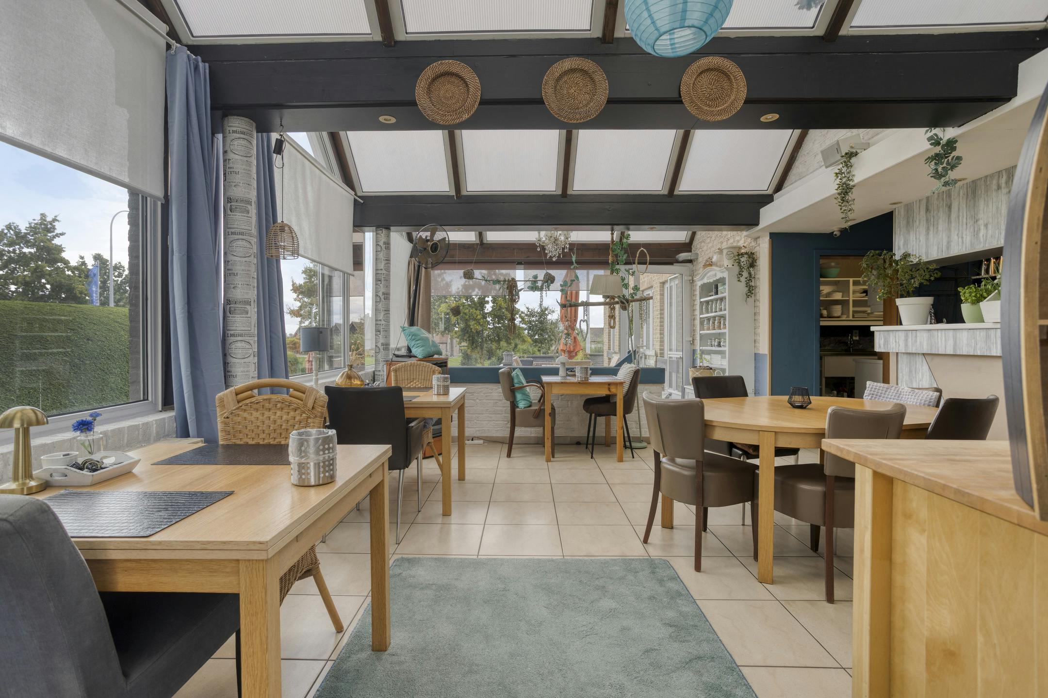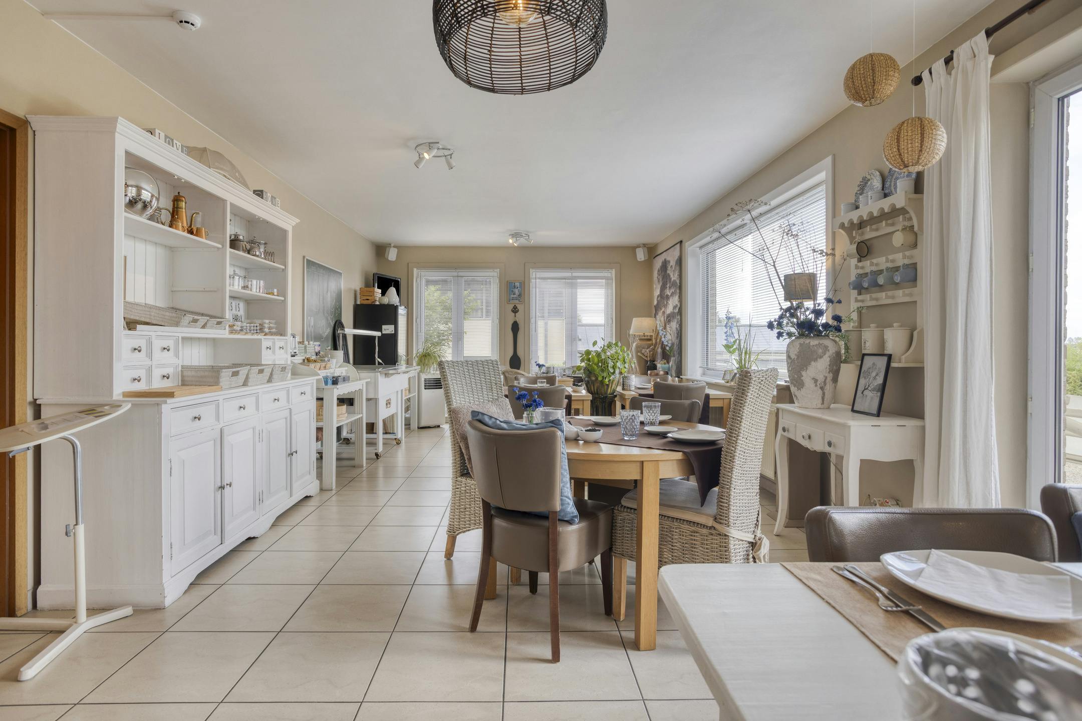 Gelijkvloers : onthaal/receptie, ontbijtruimte met keuken en koelkamer, toiletten, 4 tweepersoonskamers met badkamer - terras.