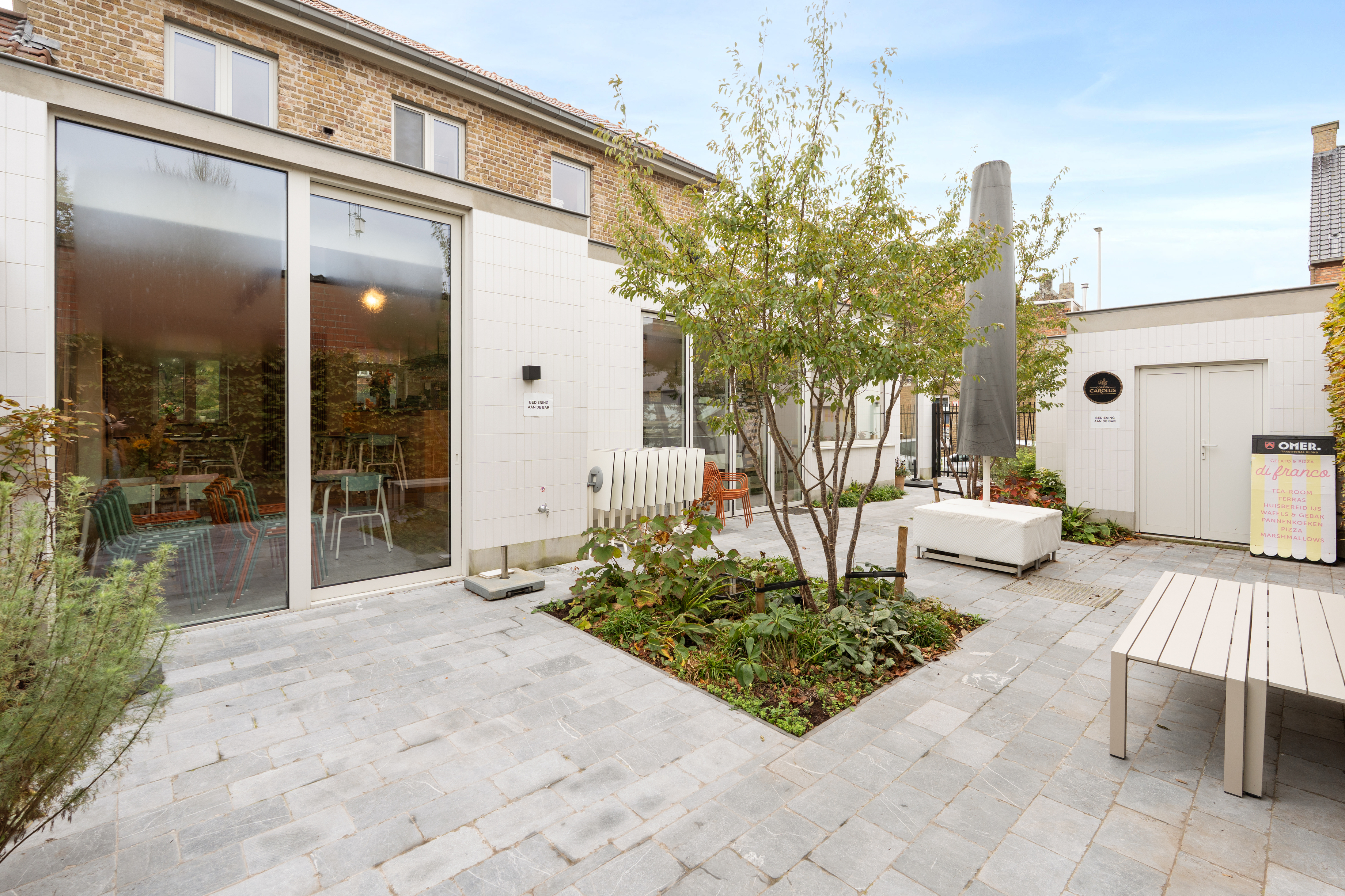 * gelijkvloers: inkomhall, gelagzaal 40m² die rechtstreekse toegang geeft naar het terras, ijs- en koffiebar met koeltoog 19m², keuken 10m² met nieuwe professionele toestellen, toiletzone en technische berging. Daarbovenop vind je aan de achterzijde van het gebouw een idyllisch aangelegde terraszone 69m², tuinberging 4m² en garagebox van 10m² (toegankelijk van op straat).