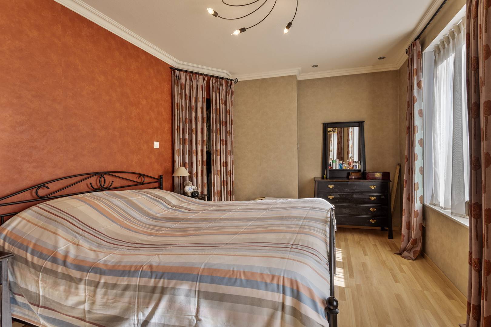 Eerste verdieping: Leefruimte met gashaard, keuken, slaapkamer 1 met ensuite dressing, ruim dakterras.