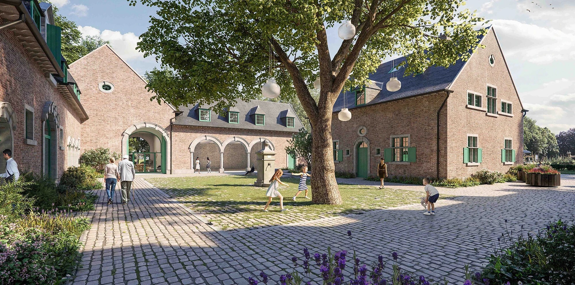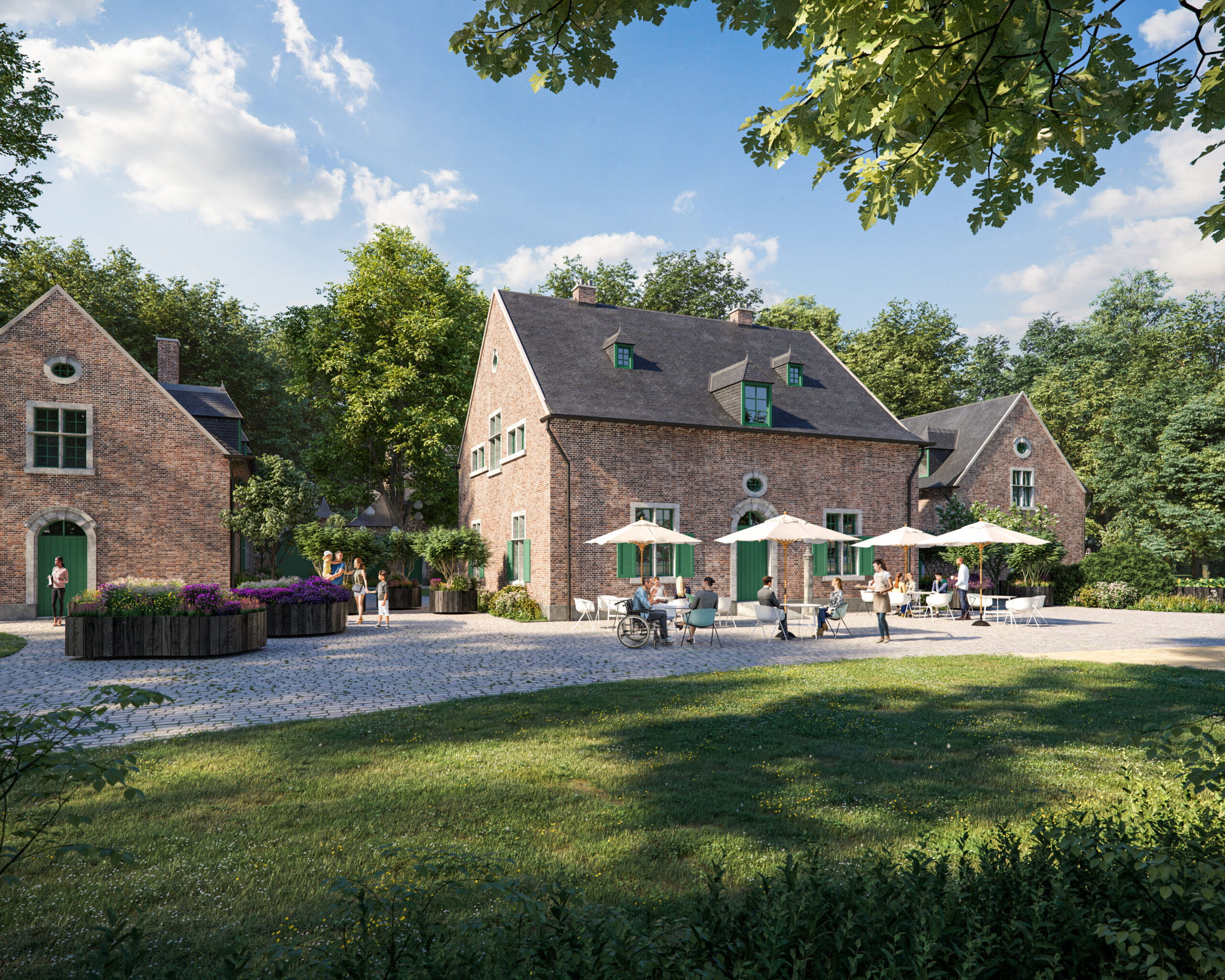 In het koetshuis en de neerhoeve realiseert projectontwikkelaar Heem een uniek cohousingproject, dat een open relatie tot het omliggende park behoudt. Geen hekken en poorten hier.