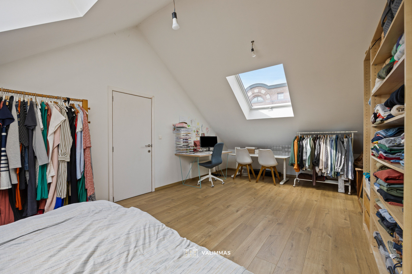 Het duplex-appartement (± 160m²) erboven bestaat uit een inkomhal, een toilet, een living, een volledig ingerichte keuken, een badkamer met inloopdouche, een nachthal, drie slaapkamers, en een tweede (nog in te richten) badkamer.