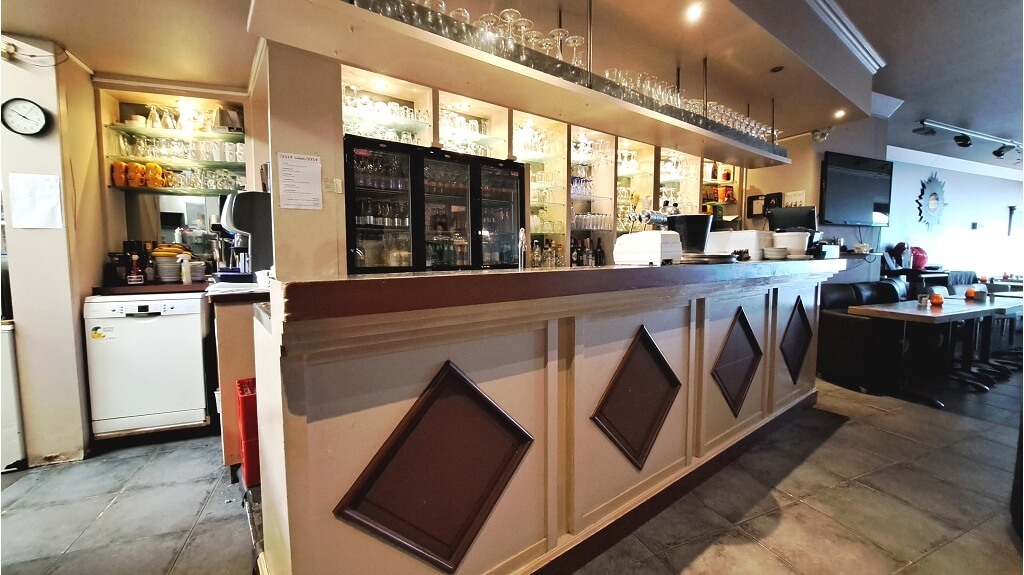 Omvat een gelagzaal met bar en veranda-terras met een capaciteit van 64 zitplaatsen, een overdekt buitenterras met een capaciteit van 36 zitplaatsen, warme- en koude keuken met afwasruimte. Verder is er ook nog een kelderverdieping met bergruimte en toiletten.